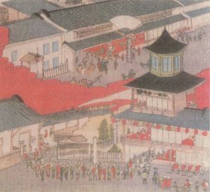 ★初代長野停車場(左がわの平屋)(「扇屋の引札」より)