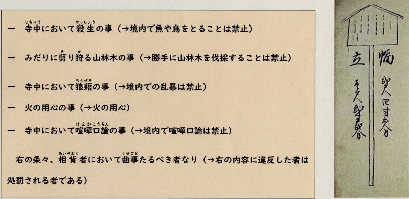 禁制の最後に松代藩士の矢島源左衛門と矢野式左衛門の名で禁制に違反した者は罰する(曲事(くせごと))と記している。