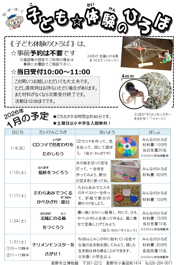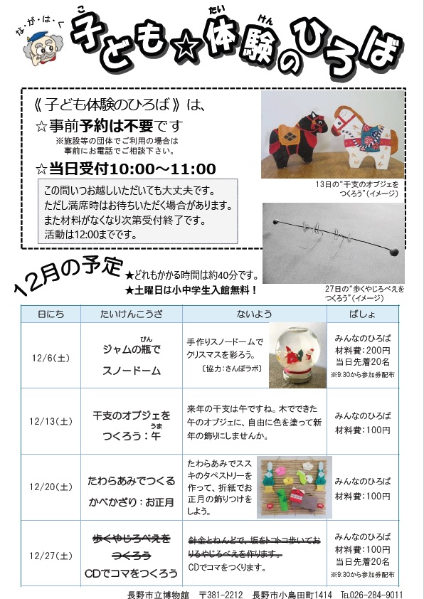 ※12月27日(土)の子ども体験広場は「CDでコマをつくろう」に内容を変更しました。直前の変更で申し訳ありませんが、ご了承くださいますようお願いします。 ※入館料が別途必要です(毎週土曜日は小中学生の入館は無料です)。 ※材料費が必要なイベントもあります。 ※団体でご利用の場合は事前にお電話でご相談ください(026-284-9011)。