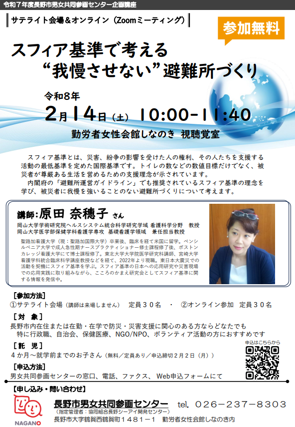 内閣府の「避難所運営ガイドライン」でも推奨されているスフィア基準の理念を学び、被災者に我慢を強いることのない避難所づくりについて考えます。