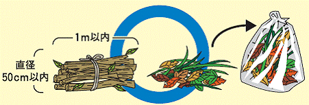 枝は1mくらいの長さに切り、直径50cmくらいの束(枝1本ごとの直径は20cm以下)にして、ひもでしばって出す(粗大ごみシール不要)