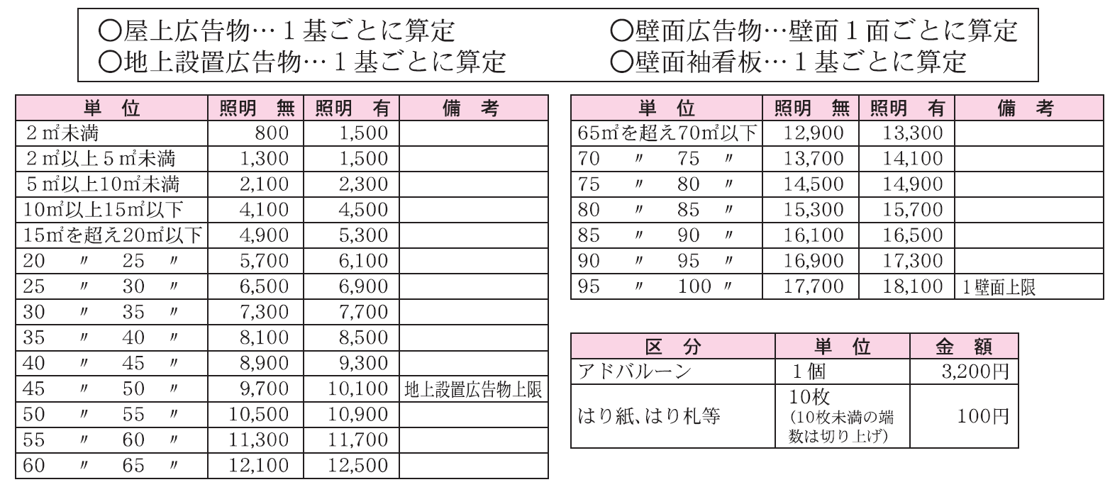 塀やフェンスなどに表示または設置する場合は、それぞれの広告箇所を対象面積とします。